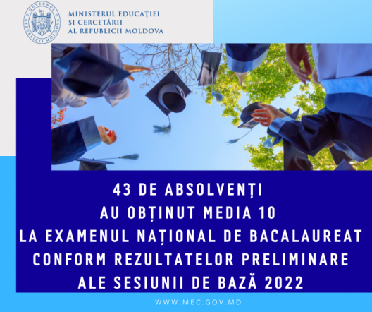 Media 10 la examenul de bacalaureat a fost obținută, până în acest moment, de către 43 de candidați, comparativ cu 16 în 2021. Acești absolvenți sunt din raioanele/municipiile: Bălți, Căușeni, Chișinău, Drochia, Hîncești, Orhei, Soroca, Strășeni, Ștefan Vodă, Tiraspol, Ungheni.