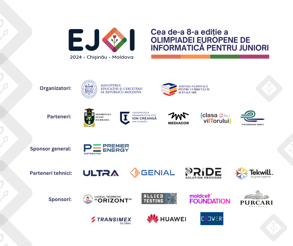 În perioada 16-22 august 2024, la Chișinău se desfășoară a VIII-a ediție a Olimpiadei Europene la Informatică pentru Juniori (EJOI), ai cărei organizatori sunt Ministerul Educației și Cercetării și Agenția Națională pentru Curriculum și Evaluare.