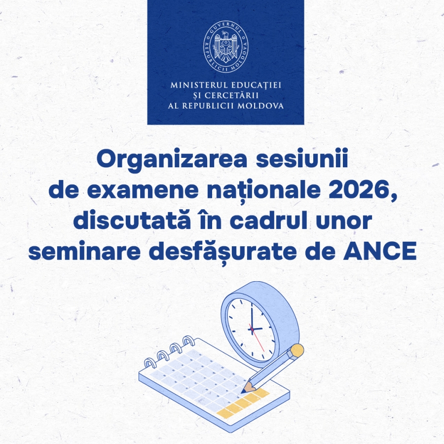 Organizarea și desfășurarea sesiunii de examene naționale din 2026 a fost subiectul seminarelor de instruire organizate de Agenția Națională pentru Curriculum și Evaluare (ANCE), în zilele de 28 și 29 ianuarie, în format online. La ședințe au participat reprezentanți ai organelor locale de specialitate în domeniul învățământului (OLSDÎ), ai instituțiilor de învățământ cu statut republican, ai colegiilor și centrelor de excelență, precum și ai instituțiilor de învățământ superior. De asemenea, au fost prezenți șefi adjuncți responsabili de evaluare din 35 de raioane și municipii ale țării, precum și administratorii Sistemului Automatizat de Prelucrare a Datelor (SAPD), inclusiv din instituțiile de învățământ din Tiraspol și Bender.